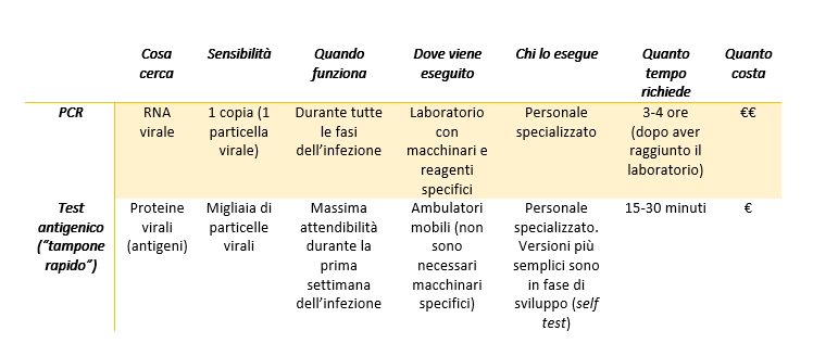 Mentre la PCR è in grado di individuare anche quantità molto piccole di materiale genetico, e quindi può essere usata in tutte le fasi dell’infezione, incluso sui pazienti asintomatici, la sensibilità dei test antigenici è decisamente inferiore (il risultato è positivo solo se è presente una quantità notevole di proteine). Per questo al momento i test antigenici vengono impiegati solo su pazienti sintomatici per confermare la causa dei sintomi, ma non sono un metodo ufficiale per lo screening: il risultato dei test antigenici deve essere confermato tramite PCR, che rimane l’unico metodo diagnostico ufficiale.